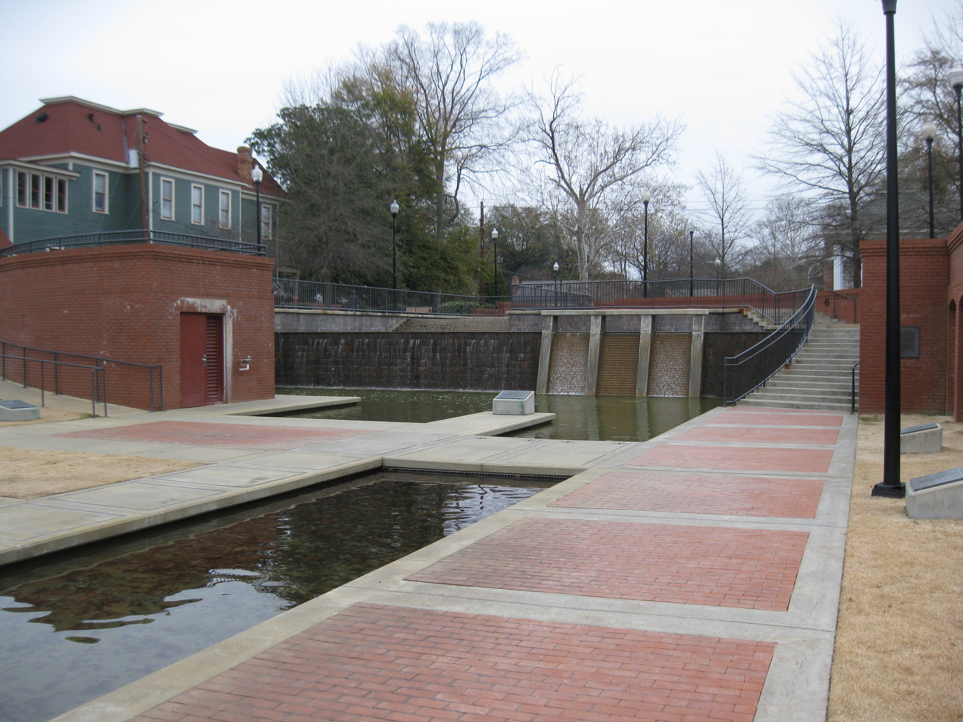 Pemberton is the only figure represented as himself at Heritage Park. The other entrepreneurs are interpreted through depictions of their industries. A water element runs through the park from east to west representing the Chattahoochee River. On the river are representations of the Chattahoochee’s dams and the skeleton frame of a steam paddleboat. The plaques accompanying these representations speak of the men that oversaw the construction of the dams and led the trade routes on the Chattahoochee. Additionally, the plaques gave a condensed timeline of events that changed the framework of these companies.