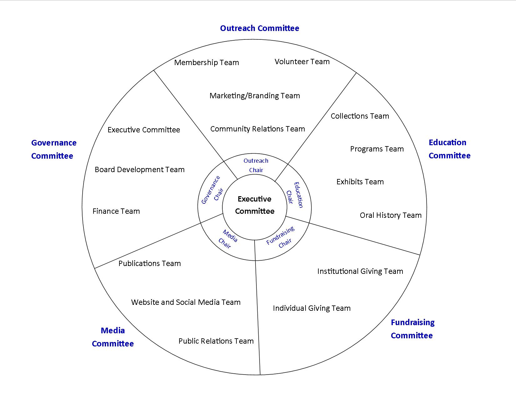 Many of the groups that we used to call committees – membership, collections, finance, oral history, etc. – are now called teams. Each of the five committees has several teams within it, and each team has a team leader. Committee chairs must belong to the Board of Directors, but team leaders do not need to sit on the Board.