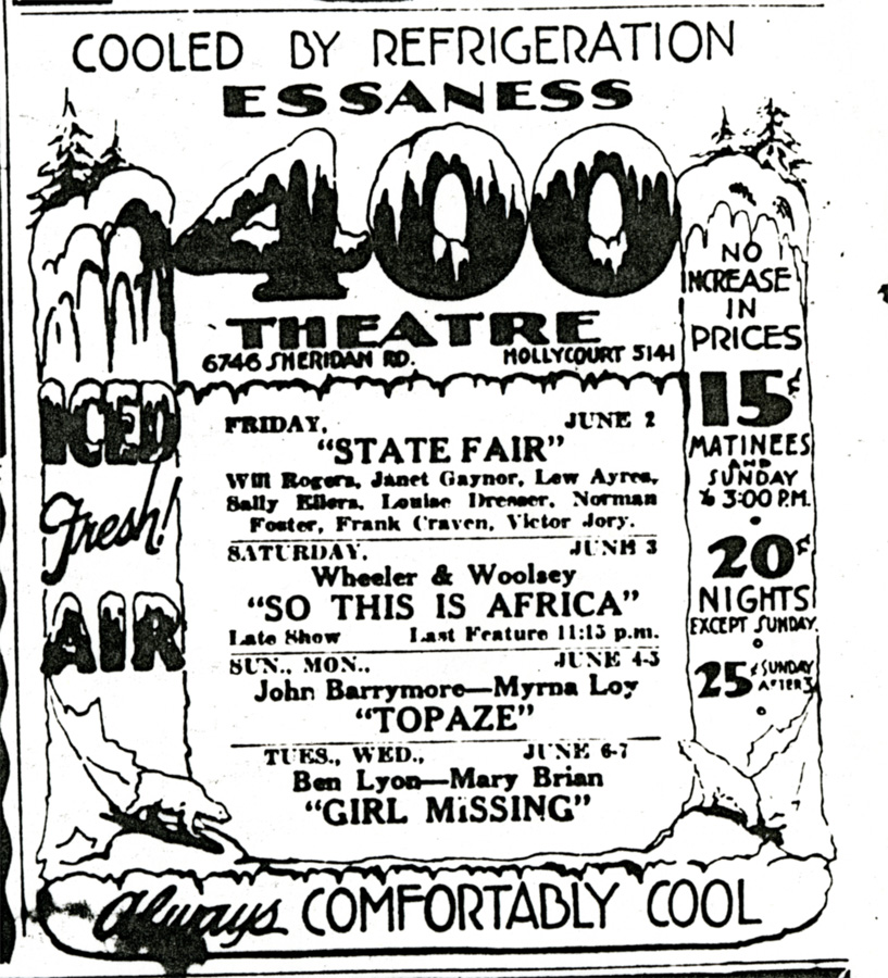 As the 1920s ended and the Great Depression took hold, entertainment businesses sought to provide more value for customers while lifting the spirits of a frustrated populace. In 1930, the theater changed its name to the 400 Theater; “The 400” was a then-common term referencing the most affluent members of society – similar to the phrase “Fortune 500” today. The idea likely was to stroke the egos of patrons, though the drop in admission prices (matinees went from 35 cents to 15 cents) was surely more appreciated. The theater also added air conditioning in 1933 and held Saturday matinee parties for children, complete with “400” Brownie Ice Cream. Then ran by the Essaness Theatre Company, the theater advertised its new A/C with the words “Always Comfortably Cool”, “Iced Fresh Air!”, and, most importantly, “No Increase in Prices.” A paucity of available records makes identifying owners difficult, but sources indicate that the Rail Theater Corporation ran the theater next from 1937 to 1945 at least.