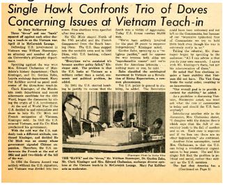“Every time we’ve escalated it’s because another policy has failed,” Loyola sociology professor Clark Kissinger, one of the “doves” on the panel, is quoted as saying in the Skyscraper, addressing the motivations behind the United States’ escalation of its involvement in the Vietnam War [1]. Reporters at the entirely student-run, Mundelein College newspaper were covering the April 26, 1967 Vietnam War Teach-In, an opportunity for discussion and reflection about the causes and implications of our nation’s continued involvement in the conflict abroad. While the headline clearly addresses the tension between those on either side of the debate, the panel distribution hints at the majority political leanings of the school’s student body and staff as well.