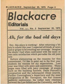 “…the more or less calm satisfaction…” The September 25, 1975 editorial in Loyola Law School’s Blackacre speaks to the tumult that the university had experienced in the first half of the decade, and the present “contentment” felt after a year of “news and controversy.” There had been faculty resignations, “publicity controvers[ies],” and a rift between the law school and the university about a proposed Legal Aid Clinic. However, the start of 1975 brought a year of all seats on the faculty being filled, a functional Legal Aid Clinic, and the redesign of classrooms. The editorial attributes these changes to the “student activism of the past two years” that was “instrumental in effecting a change in the University’s position toward the law school,” as well as the new Dean Murdock [4].