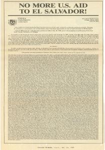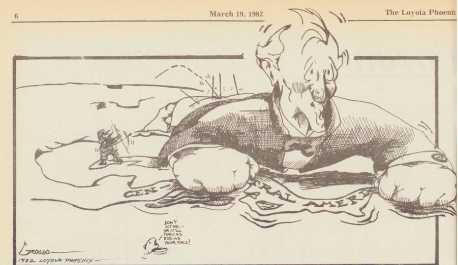 On March 19, 1982, the Loyola Phoenix published a political cartoon depicting Uncle Sam grabbing Central America and clenching it between his fists as Cuba’s Fidel Castro shoots arrows into his behind [5]. Later, in a continued attempt to shine a light on the United States’ military involvement in Central America, Loyola students and faculty published a full page ad in the Chicago Tribune, calling for the withdrawal of economic and military aid from El Salvador after a string of brutal killings of Jesuit-affiliates by the Salvadorian military [6].