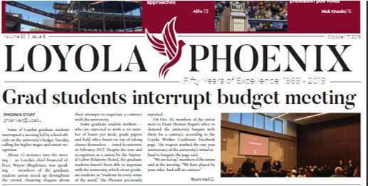 Current examples of activism and it’s coverage in student publications is evident on October 17, 2018, as graduate students crashed a budged meeting “calling for higher wages and union recognition.” Long a source of tension in university environments, the demands of many graduate students workers—demands that often require a set number of hours per week, in addition to grading papers, holding office hours, and attending their own classes—felt untenable to many, and they voiced these concerns. “We are fed up,” members of the union are quoted in the Loyola Phoenix as saying. To date, they have not been able to negotiate with the university, as Loyola representatives have expressed that graduate student workers are “students in every sense of the word” [7].
