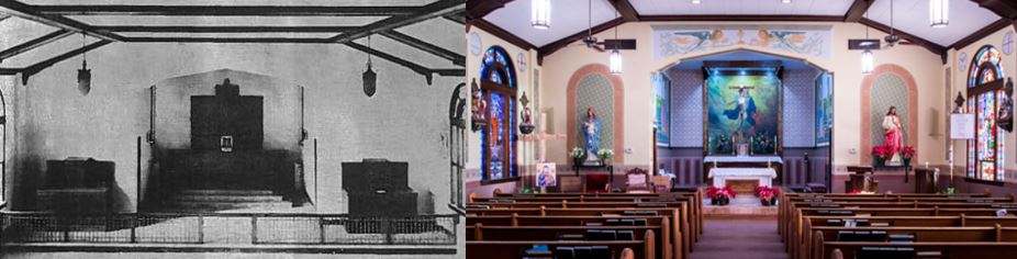 Figures 3 and 4: Left: Interior of St. Mary’s church prior to decoration by Italian POWs. Exact date unknown. Right: Sanctuary of St. Mary’s Catholic Church in Umbarger, Texas. Interior decoration by Camp Hereford POWs and Loyola students. (Photo Credit: St. Mary’s Catholic Church, Umbarger, TX. Accessed December 11, 2018, https://stmarysumbarger.com/)