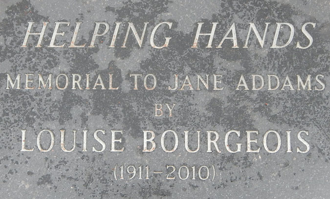 The “Helping Hands” memorial to Jane Addams is situated within the Chicago Women’s Park & Gardens near the Prairie Historic District. Louise Bourgeois created the sculpture in 1993 to commemorate the life and works of Jane Addams, founder of Hull House and renowned advocate for women’s rights.[1] It is one of the first monuments in Chicago to memorialize a woman.
