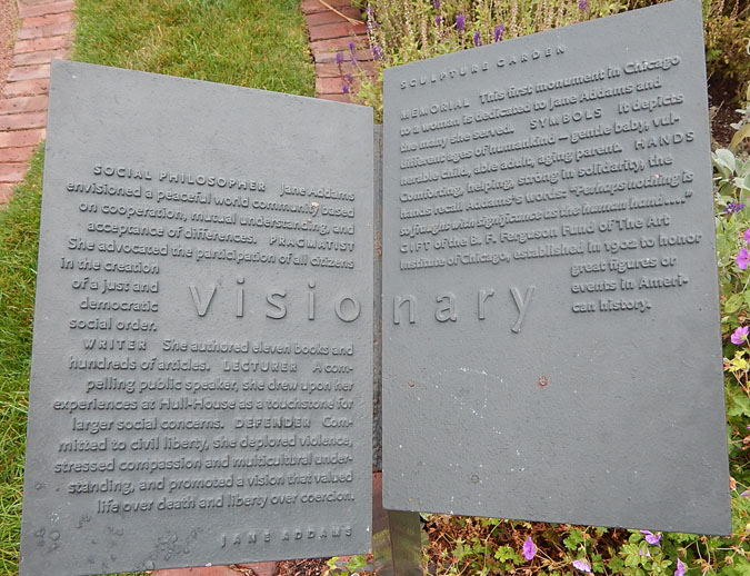 While perhaps not as common as memorializing generals or statesmen, memorializing advocates who cared for and made the world a better place is worthwhile. The symbolism of “Helping Hands” is lovely and evocative, and sitting in the Chicago Women’s Park & Gardens is a suitable context (though the Hull House Museum, located a short distance away, also seems